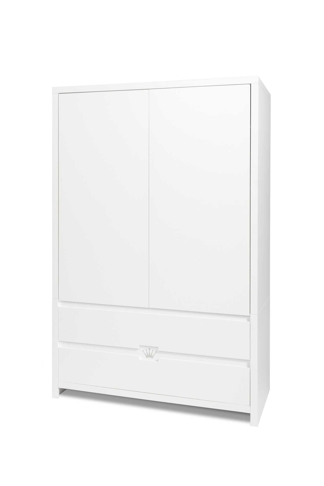 De kast heeft 2 deuren en 2 ruime laden met soft close sluiting. Binnenin de kast zijn 2 hangroede met een diepte van 60cm zodat er later volwassen kledinghangers kunnen worden ingehangen. De MDF planken zijn verstelbaar in hoogte.