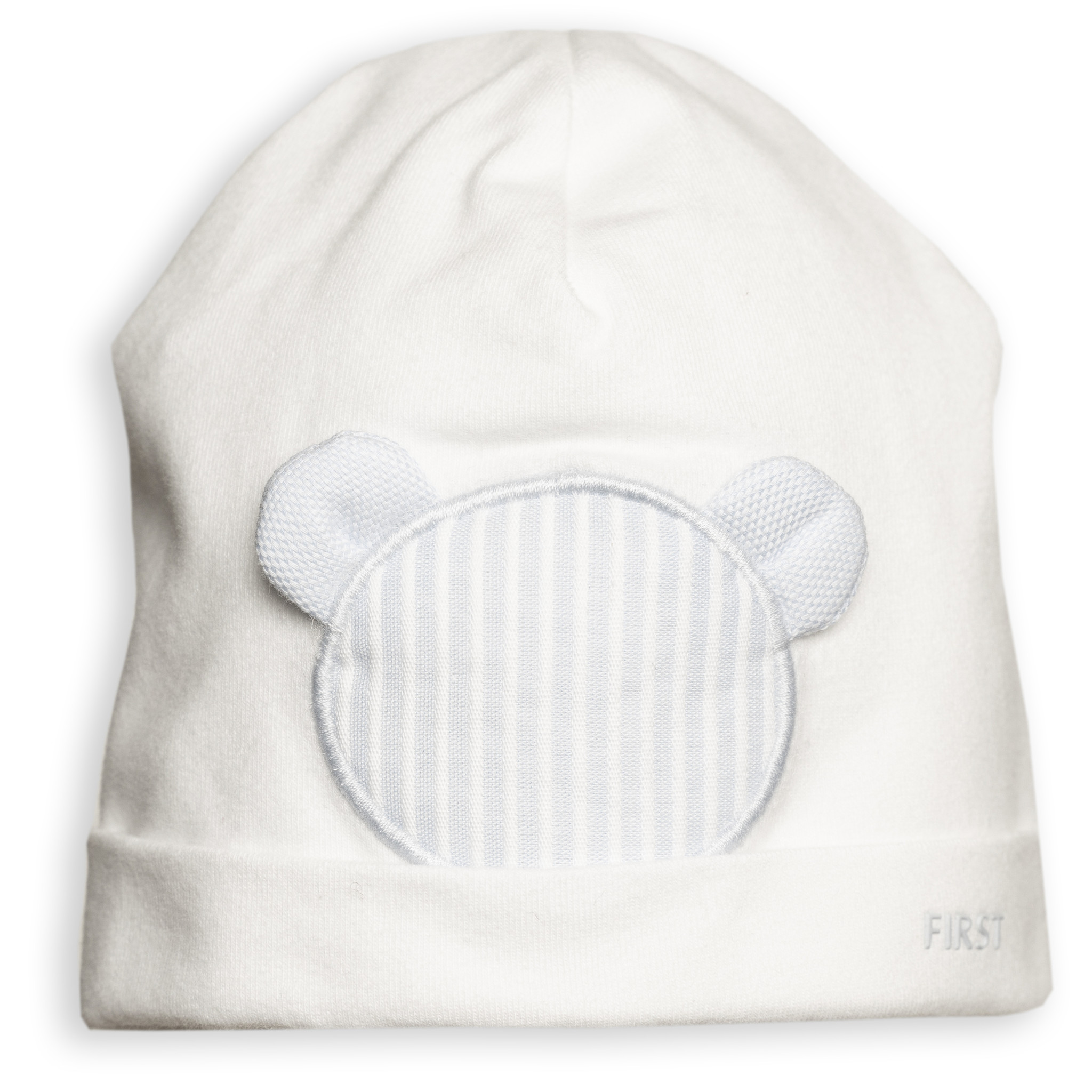 First babymutsje met beertje - wit/blauw