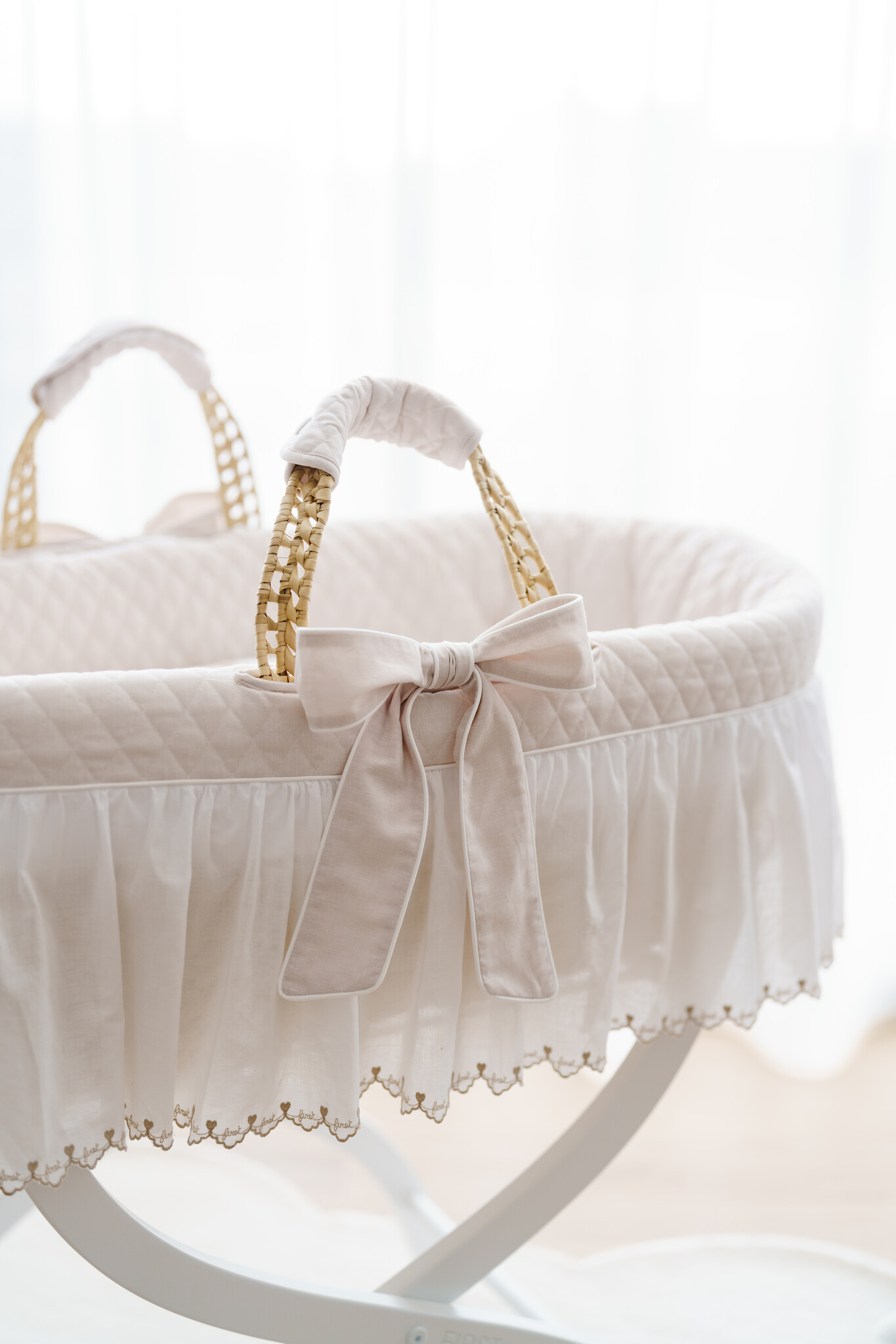 Mooie details zoals een geborduurde hoes en FIRST-kantafwerking rondom de wieg.
